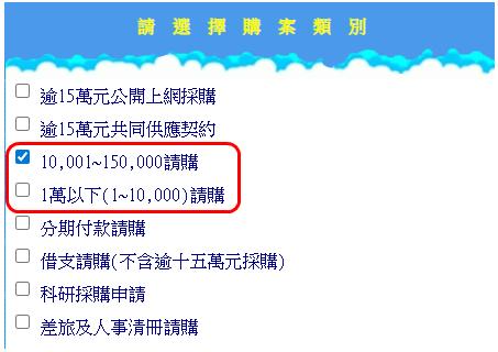 「1萬元以下(1~10,000)請購 (零用金)」及「逾1萬元至15萬元(10,001~150,000)請購」兩種格式,